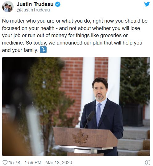 杜鲁多总理已经表示,不能让任何一个加拿大人为支付账单、支付租金或购买食物担心,我们要照顾好所有人。这涉及到所有的行业,涉及到最弱势的群体,今天公布计划就是基于这些。