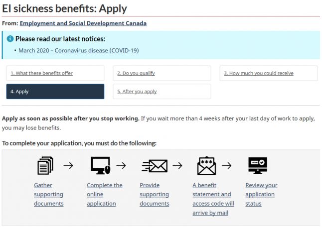 申请网站是:https://www.canada.ca/en/services/benefits/ei/ei-sickness/apply.html