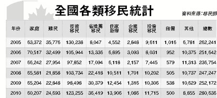 移民部限制申请数量的措施,主要针对投资移民、技术移民及企业移民三个类别,自7月1日起实施至明年6月30日,为期一年。移民部会主力处理积压个案,因此年终时的总抵移民人数则不变;去年加国吸纳逾28万名移民。