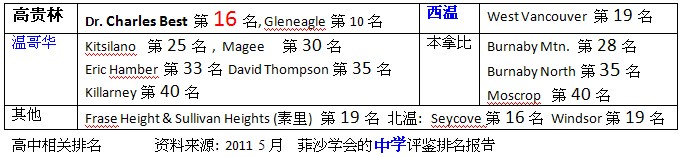 HERITAGE WOODS SECONDARY Public, 9-12 (在小坡半山上) ... BC 公立高中,排名前5名 (2011~2012)
