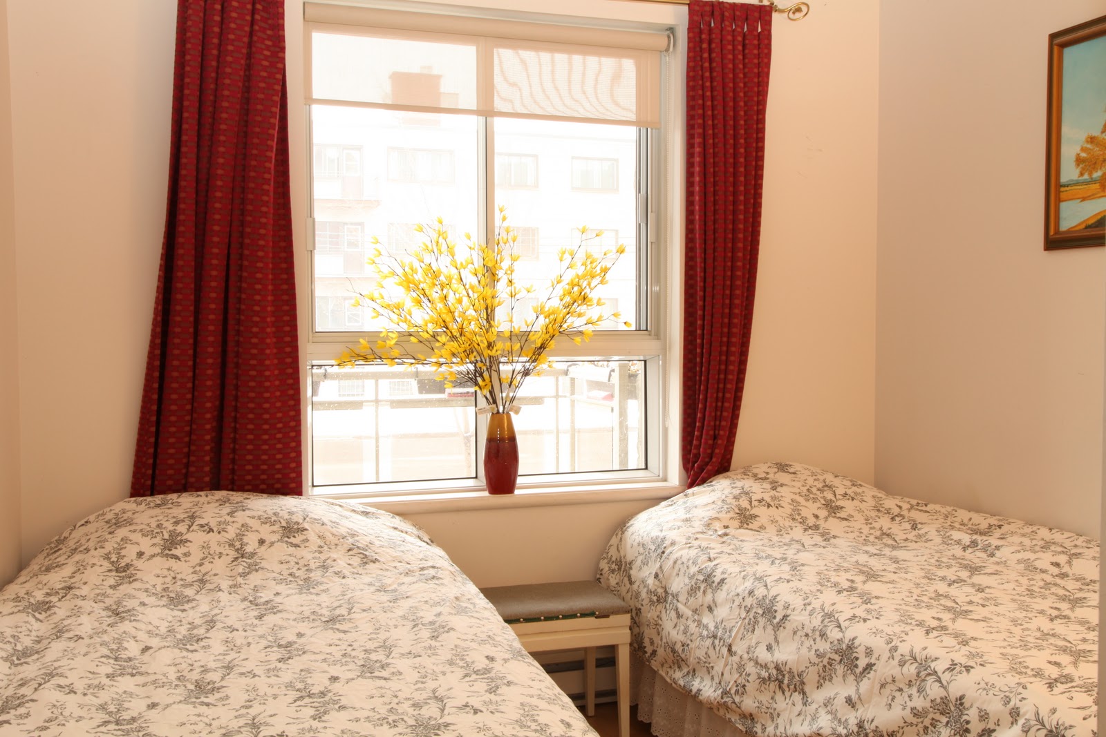 中卧20平米,大玻璃窗,窗外面对公寓花园,同样有双人床和单人床;