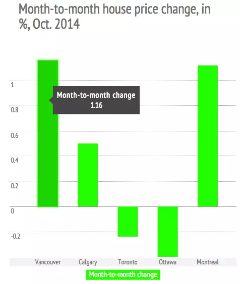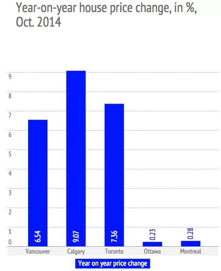 温哥华,卡尔加里和汉密尔顿房价持续上涨,蒙特利尔的房价的走势在过去的一年内也趋于平缓。