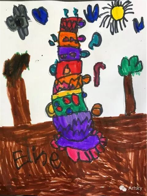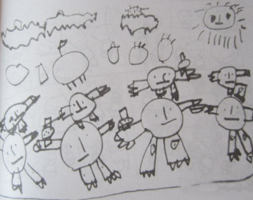 三岁左右,圆圈上画上点和横线的头部人像的形象开始在孩子的画中出现,同时还会给事物加以拟人画处理,而孩子给这些形象所赋予的不同身份的能力正是语言能力的进一步发展。在这种表征手法的表现画面当中,家长千万不要质疑孩子为什么不画耳朵手脚等,只需要耐心并愉快地倾听孩子们的故事就可以啦。