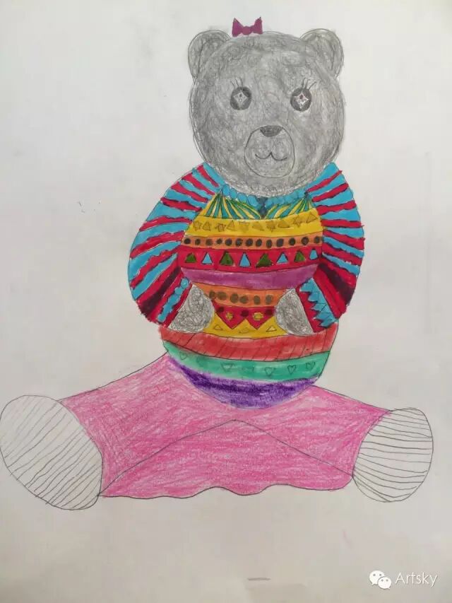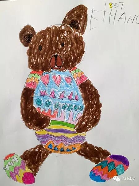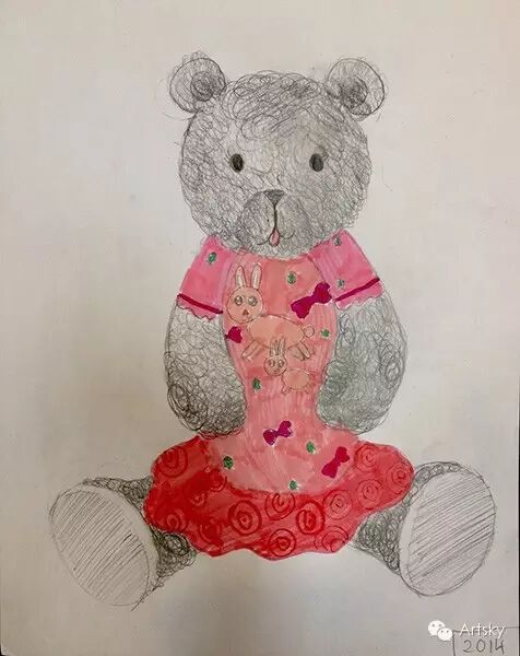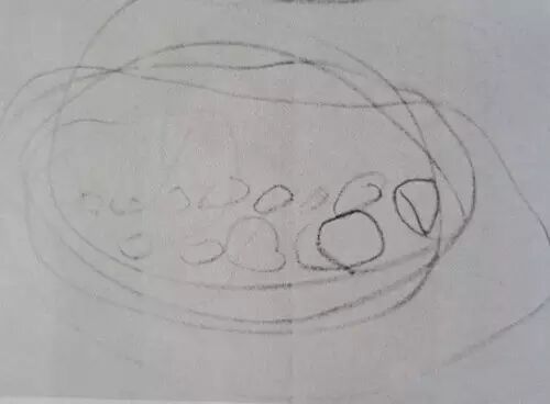 这阶段不可忽视的是孩子对图案纹饰的涉及,孩子开始有了将事物抽象化和图案化的能力,这也是书面语言和文字的基础发展。孩子甚至能将听到的故事表达丰富的画出来。