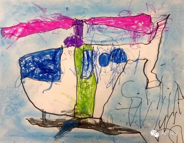 这段时期欣赏孩子的作品时最好的方法就是听听孩子讲诉画里的各种关系。在孩子二至四岁时我们只要问这是什么,而到了五岁时,我们应该多问问画里的各种故事情节,并在生活中尽量丰富孩子的娱教活动。
