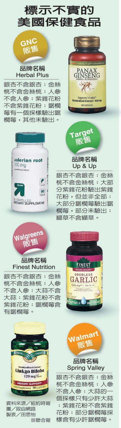 纽约时报报导,纽约州司法当局表示,已针对健安喜(GNC)保健食品连锁店丶塔吉特(Target)百货公司丶沃尔格林(Walgreens)药妆连锁店和沃尔玛(Walmart)百货公司的热销保健食品进行检验,发现五种产品中就有四种完全未含标示上的药草,通常只含有一些便宜的填充物,像是粉状的米丶芦笋或室内盆栽植物,有时含有对过敏体质者危险的成分。