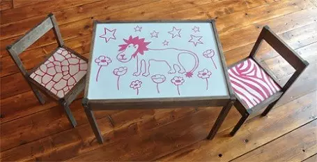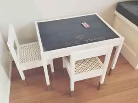 这套桌椅我家也有一套,因为实在是太便宜啦。简单喷个漆,白色桌面贴个图案就挺不错的。