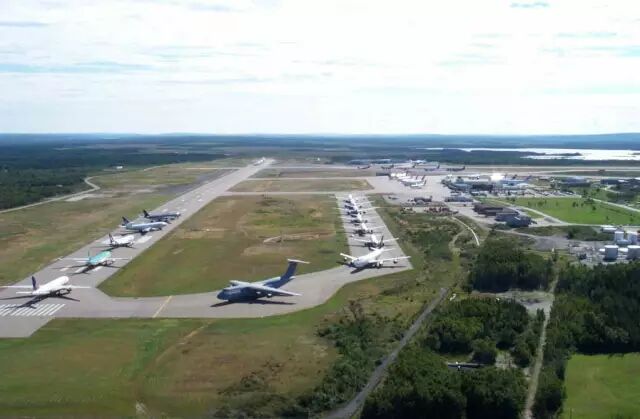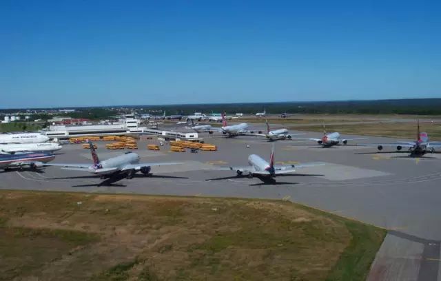 加拿大纽芬兰的甘德机场上同样停满了来自欧洲的航班,共计53架。