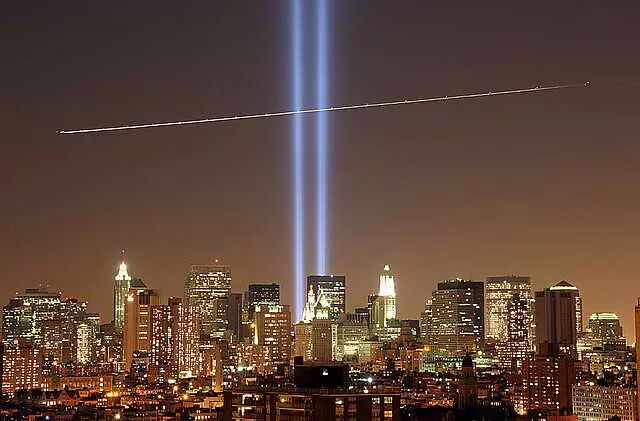 在2003年9.11纪念日,两束代表世贸中心的探照灯光射向夜空。