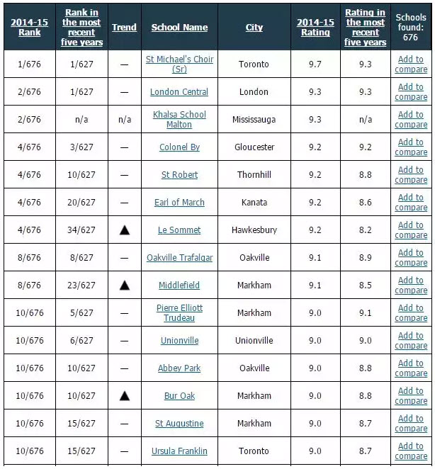 安省中学2016年成绩单排名是基于去年安省全省范围的10年级的语文统考以及9年级的EQAO数学技能测试的成绩,以7个学术指标来综合评分,今年全省共有676间公立中学、天主教中学以及一些私立中学参与排名,比去年的749间中学要少。