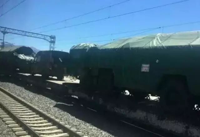 中印边境对峙事件持续发酵,印度防长近期又高调发声,表示印军已经吸取1962年战败的教训,有能力打赢任何战争。不过,解放军则一直低调进行兵力部署,不断向西藏运送各种型号的重型装备。图为网友拍摄到的军列搭载的东风系列弹道导弹。