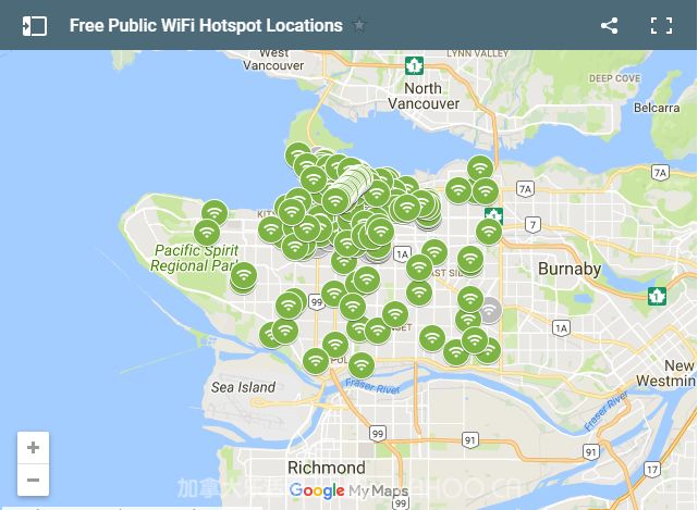 笔者经过进一步了解,找到一幅非常详细的温哥华免费wifi分布图,可以查到每个WiFi的具体位置:点击下面链接,即可进入免费WiFi详细分布地图。