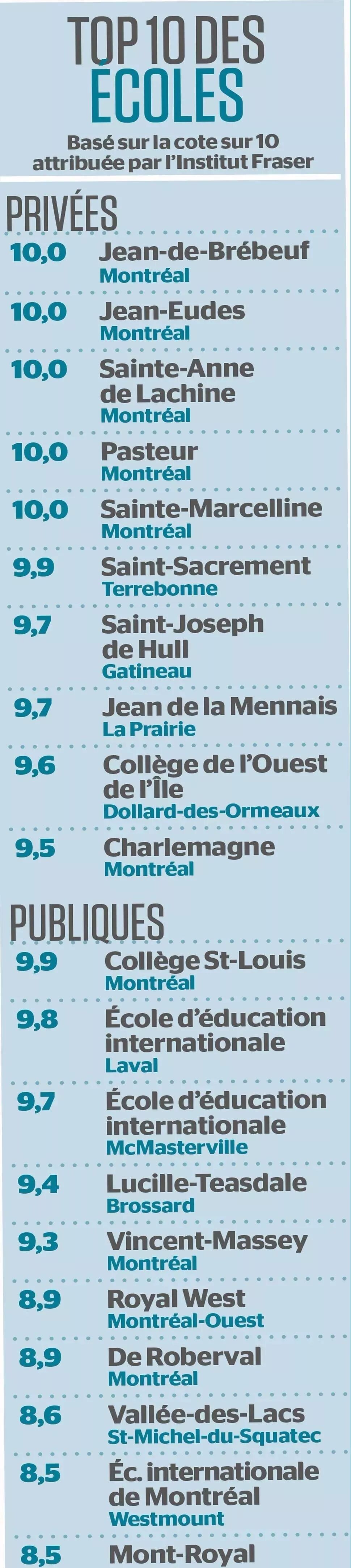 公立中学排名中,蒙特利尔的Collège Saint-Louis 学校排名第一,Laval市的École d'éducation internationale位居第二,排名前10的几乎都是国际学校。