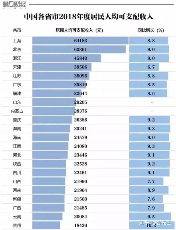 还有,2018年各省人均可支配收入差距也很大: