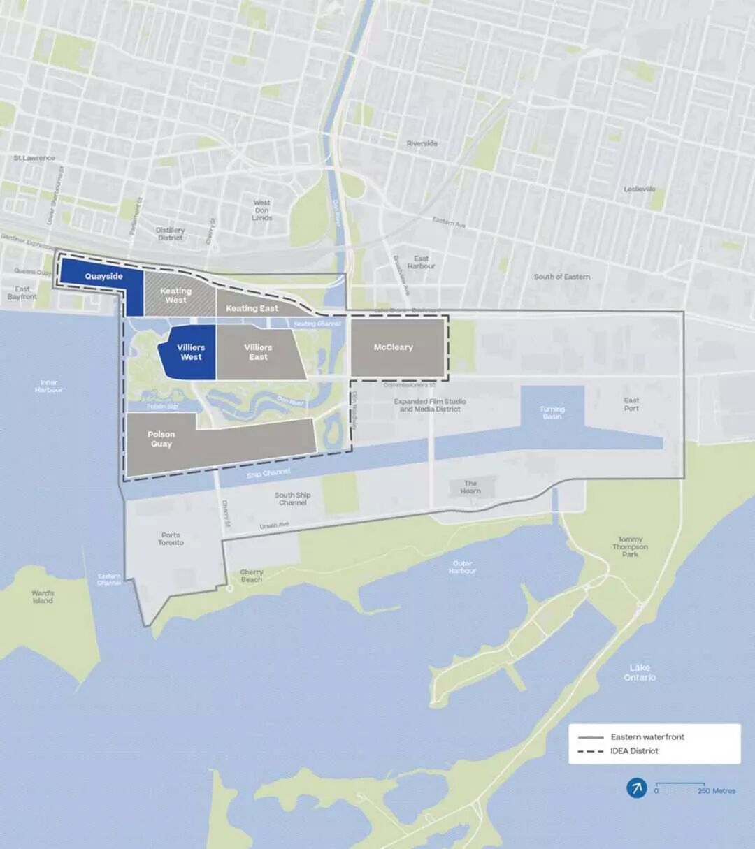 190英亩土地的其余部分包括Villiers岛的其余部分,Polson码头和Don河以东的一块土地。