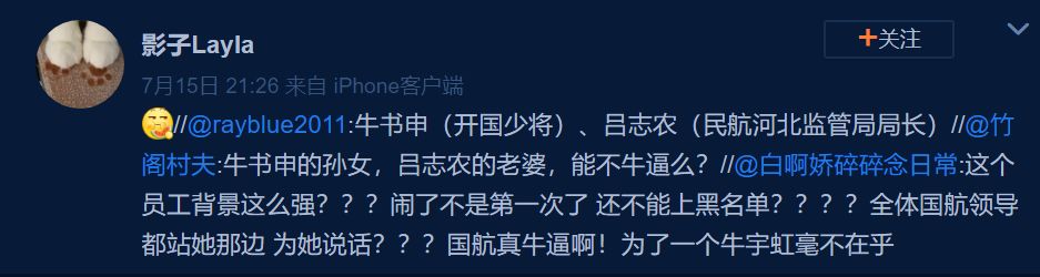 事件一经曝光,引发网络对牛宇虹和国航的挞伐声浪,