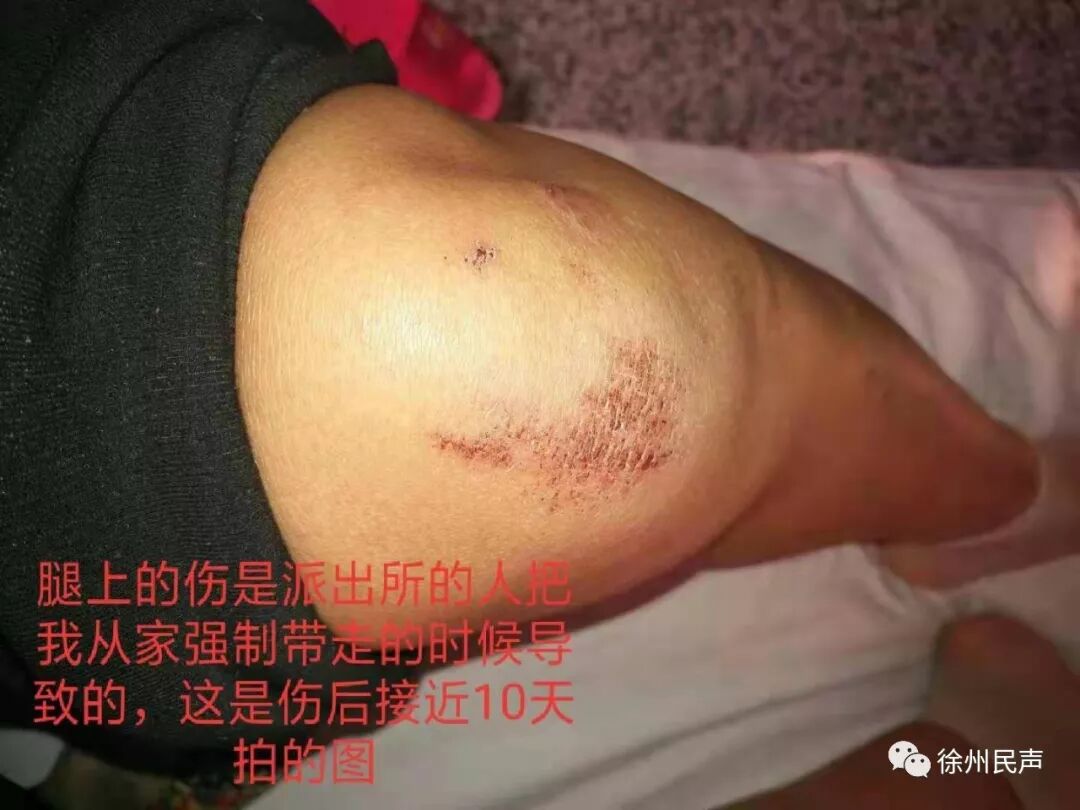 半小时后,四位民警突然冲进入我家,他们以我涉嫌寻衅滋事为由要将我带走,我一时没有反应过来,我和丈夫工作十几年来,勤勤恳恳,本本分分,我们也教育孩子诚实做人,好好学习,我们怎么可能涉嫌寻衅滋事呢? 没等我反应过来,两位民警称“去一趟派出所半小时,最多一小时就让我回来”我的儿子和女儿从来没有见过这样的场景,他们被吓地大哭了。孩子坚信警察叔叔是抓坏人的,妈妈怎么也成了坏人呢? 我问民警我究竟犯了什么罪要把我带走,此时,丰县城东派出所副所长罗烈破门而入“你挺牛逼,叫你走,你还不走”。他将我拖拽下楼。 我穿着衬衫,光着脚,在寒冬的深夜,我大哭着问他们为什么抓我?