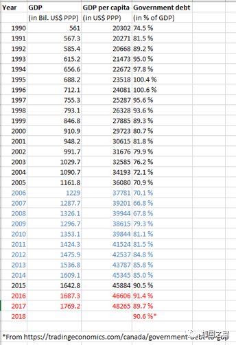 加拿大人欠的钱,其实是哈珀在2008年到2010年花掉的,债务比一下子从43%跳到55% 。 把从1995到2008年13年的减债结果全毁。