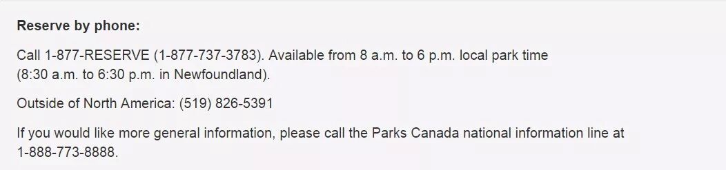 另外,除了线上预定外,公园部也开通了电话预定:1-877-RESERVE (737-3783) ,电话服务时间是每天上午8 a.m. 到下午 6 p.m 。(8:30 a.m. to 6:30 p.m. in Newfoundland).