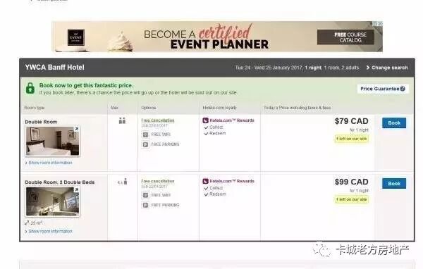 再来看看公园4星级酒店Delta Hotels by Marriott Banff Royal Canadian Lodge,在同一期间,6人的话,需要2人间+4人间,一共是211+211=422加元。如果两间3人间就更贵了。