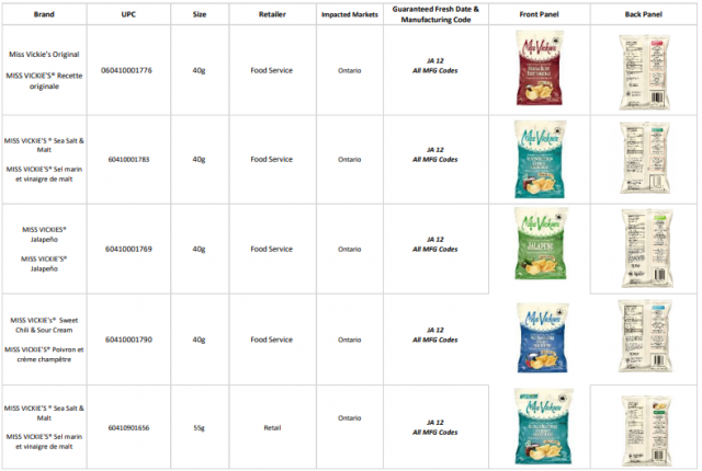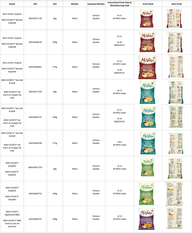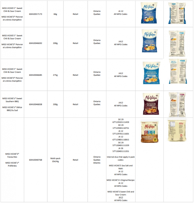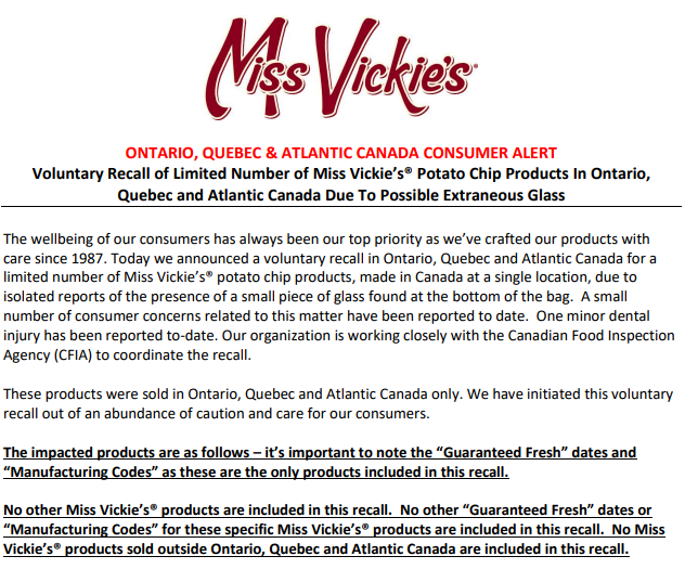 Miss Vickie's因其生产的部分薯片内存有玻璃碴而自行召回,这些商品在安省、魁省、新不伦瑞克、纽芬兰和拉布拉多、新斯科舍省,以及P.E.I.地区销售。