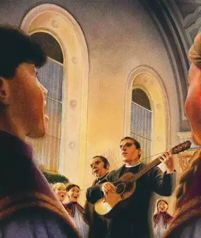 莫尔神父在狭小的办公间内重写他的讲道,当他小憩之时,推开窗门,望向那白雪皑皑的山谷,他一下回想起了千年前的佳音,忽然思如奔涌,想到可以为晚上的崇拜写一首简单的歌曲,用他的旧吉他伴奏。